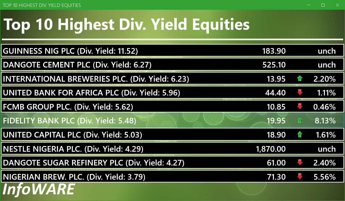 Dividend stocks distribute a portion of the company earnings to investors on a regular basis and they can a great choice for investors looking for regular income. As an investment or trading strategy, high dividend yield equities provide annual cash payments as against mostly capital gains in the price of a stock. The list in the table below represent the highest dividend paying stocks from the list of the most liquid stocks in the NSE top 30.