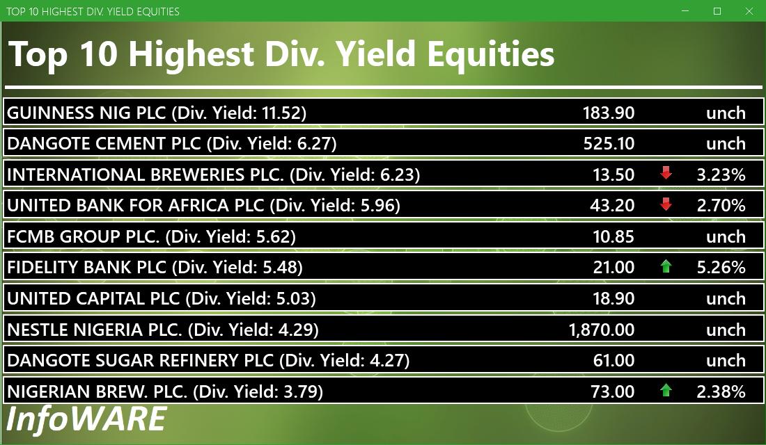Dividend stocks distribute a portion of the company earnings to investors on a regular basis and they can a great choice for investors looking for regular income. As an investment or trading strategy, high dividend yield equities provide annual cash payments as against mostly capital gains in the price of a stock. The list in the table below represent the highest dividend paying stocks from the list of the most liquid stocks in the NSE top 30.