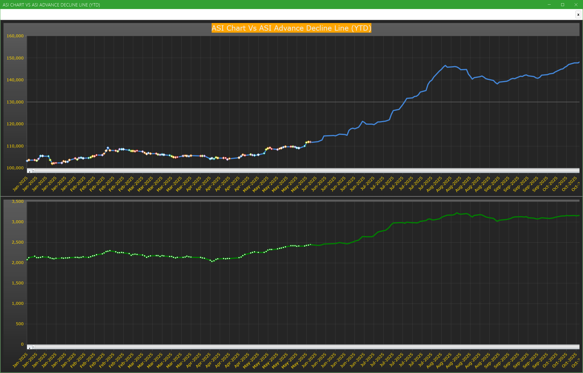 Chart Of The Day - ASI Chart Vs ASI Advance Decline Line (YTD) (22-Oct-2025 15:09:37.190) | InfoWARE Finance