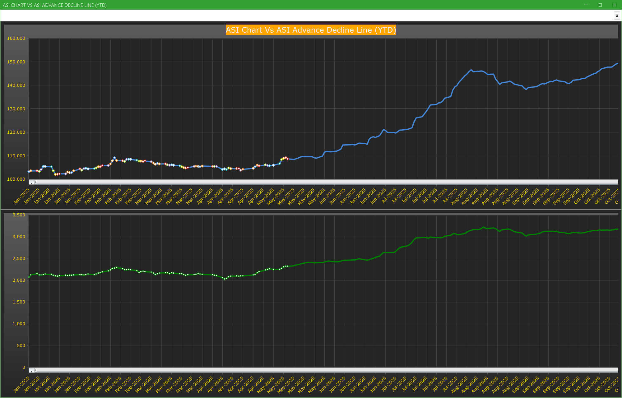 Chart Of The Day - ASI Chart Vs ASI Advance Decline Line (YTD) (24-Oct-2025 15:11:01.935) | InfoWARE Finance