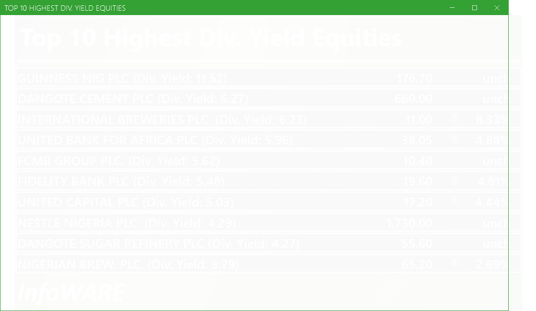 Dividend stocks distribute a portion of the company earnings to investors on a regular basis and they can a great choice for investors looking for regular income. As an investment or trading strategy, high dividend yield equities provide annual cash payments as against mostly capital gains in the price of a stock. The list in the table below represent the highest dividend paying stocks from the list of the most liquid stocks in the NSE top 30.