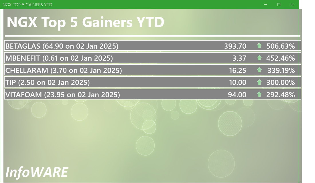 | NGXPREMIUM | 15,080.65 | -0.32 | 0.00 | -4.00 | 10.14 | 54.94 | 8,695 | |