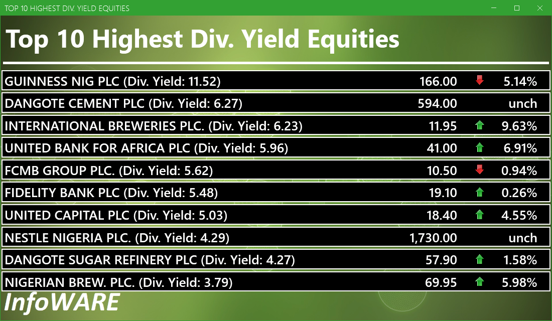 Before it's here, it's on InfoWARE Market Data Terminal; Years of Fundamentals, Analytics and more... LINKASSURE 10.00  CUSTODIAN 10.00  STANBICETF30 10.00  OANDO 9.97  LEGENDINT 9.96  NAHCO 9.96  NCR 9.88  AIICO 9.88  CHAMS 9.81  SOVRENINS 9.79  AUSTINLAZ -9.96  UNIONDICON -9.68  LOTUSHAL15 -8.03  STERLINGNG -5.81  NGXGROUP -5.31  GUINNESS -5.14  MANSARD -2.33  FCMB -0.94  WAPCO -0.70  FIRSTHOLDCO -0.48