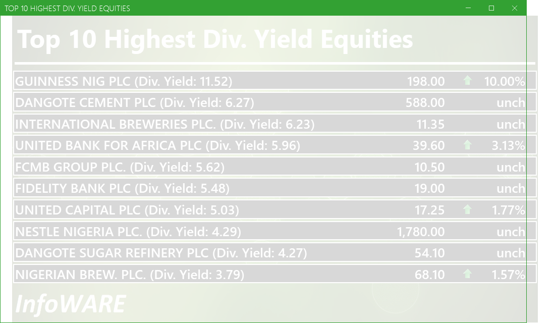 Dividend stocks distribute a portion of the company earnings to investors on a regular basis and they can a great choice for investors looking for regular income. As an investment or trading strategy, high dividend yield equities provide annual cash payments as against mostly capital gains in the price of a stock. The list in the table below represent the highest dividend paying stocks from the list of the most liquid stocks in the NSE top 30.
