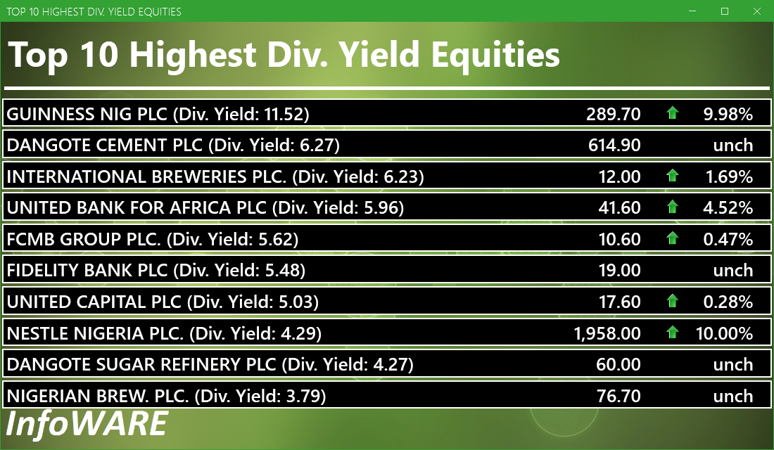 Dividend stocks distribute a portion of the company earnings to investors on a regular basis and they can a great choice for investors looking for regular income. As an investment or trading strategy, high dividend yield equities provide annual cash payments as against mostly capital gains in the price of a stock. The list in the table below represent the highest dividend paying stocks from the list of the most liquid stocks in the NSE top 30.